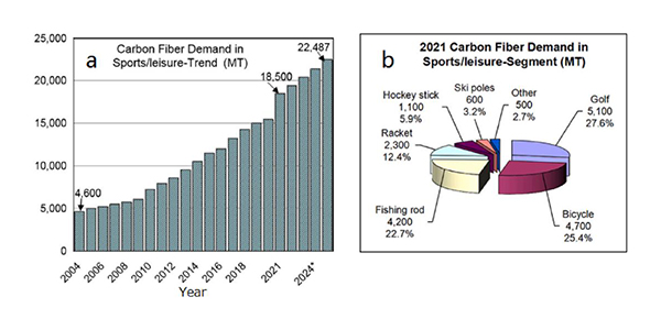 5、體育運(yùn)動(dòng):由碳纖維制成的主要產(chǎn)品是高爾夫球桿、釣魚(yú)竿和網(wǎng)球拍。自2010年以來(lái),全球碳纖維在運(yùn)動(dòng)休閑裝備中的使用呈穩(wěn)步增長(zhǎng)趨勢(shì)。2021 年,體育運(yùn)動(dòng)中使用的碳纖維數(shù)量達(dá)到了令人印象深刻的 18.5 噸。高爾夫球桿和自行車(chē)是碳纖維的最大消費(fèi)領(lǐng)域,分別占總消費(fèi)量的27.6%和25.4%。熱塑性碳纖維復(fù)合材料制作的體育用品,有望推動(dòng)競(jìng)技體育達(dá)到更高的極限,而隨著產(chǎn)能提升該類(lèi)型體育用品的價(jià)格持續(xù)走低,更容易走進(jìn)日常生活。