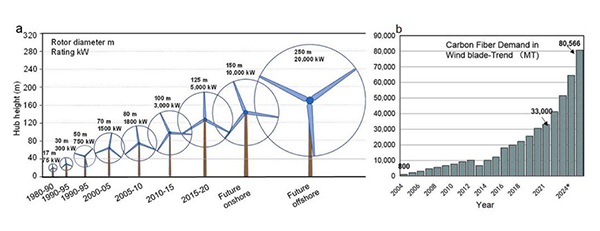 2、風(fēng)力發(fā)電:根據(jù)全球風(fēng)能理事會(huì)的數(shù)據(jù),2020年全球風(fēng)電總裝機(jī)量達(dá)到約743吉瓦,其中新增風(fēng)電裝機(jī)增長(zhǎng)53%,達(dá)到93吉瓦。在風(fēng)力發(fā)電葉片上,碳纖維比玻璃纖維具有明顯的優(yōu)勢(shì),更高的比拉伸模量、更高的比拉伸強(qiáng)度和更高的抗疲勞性能。風(fēng)力發(fā)電機(jī)結(jié)構(gòu)中的碳纖維消耗量已從2004年的約800噸增加到 2021年的30噸以上,預(yù)計(jì)2025年將超過(guò)81噸。熱塑性碳纖維復(fù)合材料同樣可以在日益增長(zhǎng)的風(fēng)電設(shè)備上廣泛應(yīng)用。