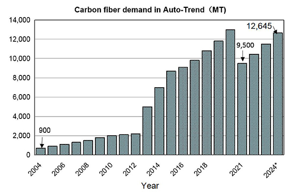 3、汽車(chē)制造:自過(guò)去十年以來(lái),全球范圍內(nèi)更嚴(yán)格的汽車(chē)排放標(biāo)準(zhǔn)和電動(dòng)汽車(chē)的快速增長(zhǎng)促使該行業(yè)重新使用碳纖維以減輕重量,在汽車(chē)結(jié)構(gòu)中采用CFRP復(fù)合材料等輕質(zhì)材料是最直接的減重方法。2013年碳纖維消費(fèi)大幅增長(zhǎng),并持續(xù)增長(zhǎng)趨勢(shì)。2021 年,碳纖維需求量為9.5噸,預(yù)計(jì)2024年將達(dá)到12.6噸以上。我國(guó)是全球電動(dòng)汽車(chē)最大的生產(chǎn)工廠,同樣是最大的終端市場(chǎng),熱塑性碳纖維應(yīng)用于汽車(chē)上可以提供更強(qiáng)勁的加速表現(xiàn),同時(shí)也提供更好的安全保護(hù)。