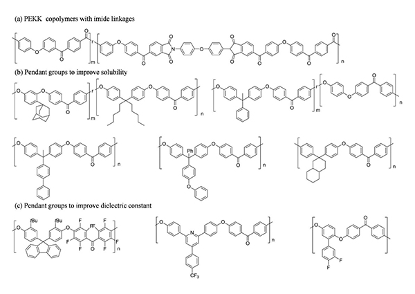 聚芳醚酮是一個(gè)大類,可以通過化學(xué)合成的方式具備不同化學(xué)分子式,以及對(duì)應(yīng)的特殊性能,可以稱之為聚芳醚酮(PAEK)共聚物。這一類共聚物很有吸引力,因?yàn)樗鼈冑x予化學(xué)和熱穩(wěn)定的聚芳醚酮(PAEK)鏈結(jié)構(gòu)額外的性能,例如更高的玻璃化溫度(Tg)、在有機(jī)溶劑中更大的溶解度、更低的介電常數(shù)和更低的吸水率等。不同共聚物組合的可能性似乎是無窮無盡的,僅受想象力和可用合成化學(xué)的限制。