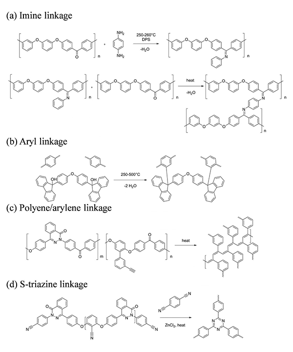 1、基于芳香族亞胺交聯(lián)的可交聯(lián)聚醚醚酮(PEEK)通過在 250 至 260°的熔融二苯砜中改性來制備。在薄膜熱壓和固化過程中,游離胺形成更多的亞胺鍵以完成交聯(lián)網(wǎng)絡(luò),交聯(lián)聚醚醚酮(PEEK)具有更高的高溫抗蠕變性和更高的玻璃化溫度(Tg)。