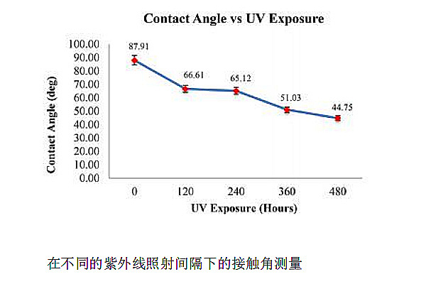 1、接觸角測角儀測試:使用光學(xué)接觸角測角儀測量參考樣品和紫外暴露樣品的接觸角,小接觸角(u<<90°)表示親水條件。作為參考以未被紫外線照射的CF/PPS層壓板為參考,它的接觸角為86~90°。在紫外線照射120、240、360和480小時的CF/PPS層壓板的接觸角分別為為66.6°、65°、51°和44.7°。接觸角值的降低表明,紫外線被復(fù)合材料中的PPS聚合物吸收,導(dǎo)致了CF/PPS復(fù)合材料表面潤濕性的增加,顯示出復(fù)合材料有高吸濕和降解反應(yīng)。