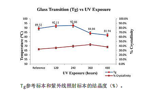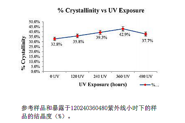 2、差示掃描量熱法(DSC)測試:采用DSC分析參考樣品和紫外暴露樣品的結(jié)晶度,結(jié)晶度對聚合物的性能起著至關(guān)重要的作用,結(jié)晶度(%)較高的復(fù)合材料具有更好的拉伸強(qiáng)度和彈性模量。研究發(fā)現(xiàn)未被紫外線照射的CF/PPS層壓板的結(jié)晶度在30~34%之間,而從DSC掃描來看,CF/PPS層壓板在經(jīng)過120、240、360和480小時的紫外線照射下,結(jié)晶度分別是35.8%、39.3%、42.9%和37.7%,結(jié)晶度呈現(xiàn)上升又回落的變化,但紫外線照射后的結(jié)晶度均高于未經(jīng)紫外線照射前的結(jié)晶度,這是紫外線為結(jié)晶過程提供了更多的能量。