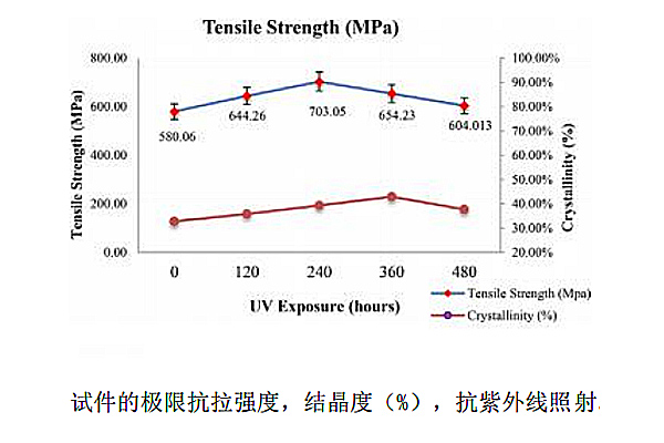 4、拉伸試驗測試:采用拉伸試驗進(jìn)行測試,觀察受紫外線照射的試樣的拉伸性能的變化。經(jīng)過測試對比,未經(jīng)紫外線照射的CF/PPS層壓板在0°方向的抗拉強(qiáng)度為580.06MPa,而經(jīng)過120、240、360和480小時紫外線照射的CF/PPS層壓板在0°方向的抗拉強(qiáng)度分別為644.26MPa、703.05MPa、654.23MPa和604.013MPa。結(jié)果顯示,結(jié)晶度隨著紫外線照射時間的增加而增加,同時也提高了材料的抗拉強(qiáng)度,但較長時間的紫外線照射,會導(dǎo)致鏈?zhǔn)綌嗔逊磻?yīng)的光氧化降解比結(jié)晶度的影響更明顯,從而導(dǎo)致強(qiáng)度的陡然降低。