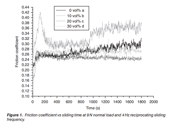 1、9N載荷力和4Hz摩擦頻率下的摩擦系數(shù)數(shù)據(jù):在9N載荷力和4Hz摩擦頻率條件下,記錄1600s滑動時間內(nèi)的數(shù)值。發(fā)現(xiàn)純PA試樣的摩擦系數(shù)隨著時間增加而迅速增大;20和30vol%的CF/PA復(fù)合材料試樣的摩擦系數(shù)呈現(xiàn)拋物線形狀,隨時間增加而增大;10vol%的CF/PA試樣摩擦系數(shù)隨時間增加先增大,然后下降到穩(wěn)定狀態(tài),隨后又突然增大。