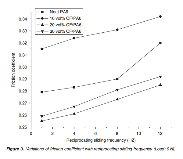 選擇室溫環(huán)境下,保持濕度在30~45%,選用純PA樹脂試樣和不同碳纖維體積占比(10vol%、20vol%和30vol%)的CF/PA試樣。對所有試樣進行表面拋光處理,再用丙酮超聲清洗,測試前再進行干燥處理。測試中,設(shè)定測試儀器往復(fù)摩擦距離5mm,載荷力范圍0~16N,摩擦頻率范圍0~12Hz,測試不同條件下的摩擦系數(shù)、摩擦損傷體積,推導(dǎo)出合理的摩擦損傷模式。