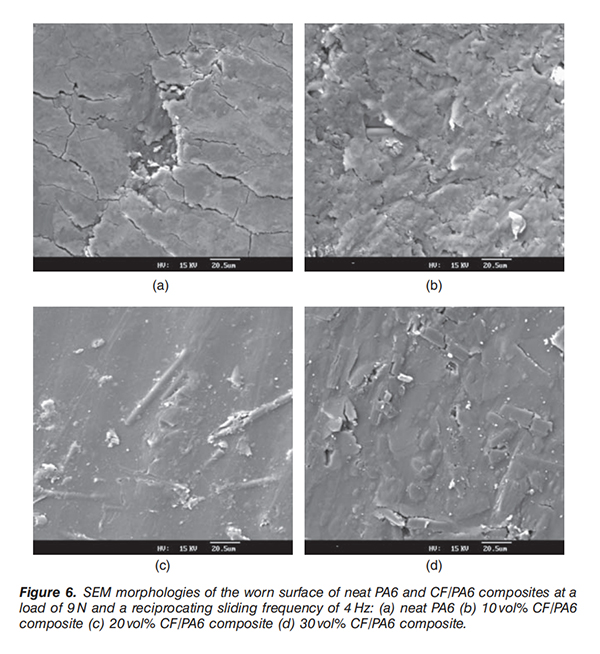 5、摩擦損傷表面電鏡掃描結(jié)果顯示:純PA試樣(圖a)有明顯微裂紋和剝離,CF/PA試樣(圖b、c和d)這種情況較少,甚至沒有,說明碳纖維的加入,顯著的降低了摩擦磨損的可能性。10vol%體積占比的CF/PA6試樣(圖b)在纖維和樹脂的薄弱點有微裂紋,說明低含量的碳纖維的耐磨性較弱;而20 vol%體積占比的CF/PA6試樣(圖6c),摩擦磨損較少,碳纖維有效支撐了載荷力,防止碳纖維和樹脂的剝離;30vol%體積占比的CF/PA試樣(圖d)基體有一個垂直于滑動方向的大裂紋,這是鄰近填料分離后形成的。