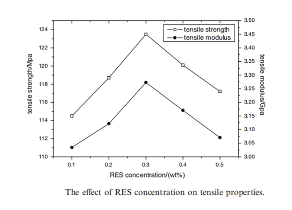 1、拉伸性能:對比不同重量百分比下稀土溶液處理后的CF/PI試樣,拉伸強(qiáng)度分別為114.5MPa(0.1wt%)、118.5MPa(0.2wt%)、123.5MPa(0.3wt%)、120MPa(0.4wt%)和117.5MPa(0.5wt%);拉伸模量分別為3.02GPa(0.1wt%)、3.13GPa(0.2wt%)、3.27GPa(0.3wt%)、3.16GPa(0.4wt%)和3.07GPa(0.5wt%)。在0.3wt%重量百分比下,拉伸強(qiáng)度和模量提升達(dá)到峰值。