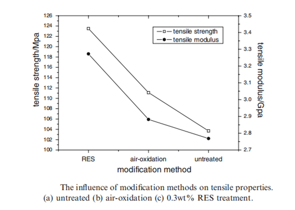 對比0.3wt%重量百分比下,未處理、空氣氧化處理和稀土溶液處理后的CF/PI試樣的拉伸強(qiáng)度和模量數(shù)據(jù),其中拉伸強(qiáng)度分別是103MPa、113Pa和123Pa,拉伸模量分別是2.75GPa、2.85GPa和3.25GPa,稀土溶液處理后的CF/PI試樣的拉伸性能提升更為明顯。