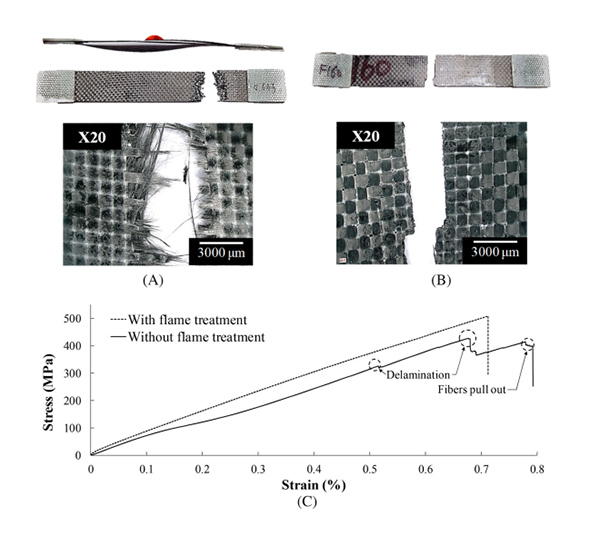 2、經(jīng)過火焰處理(下圖B):同樣在120℃溫度下,固化反應(yīng)順利進行,拉伸至斷裂后未出現(xiàn)纖維拔出和層間剝離的情況,表明火焰處理有效的去除了碳纖維表面的水分,處理后表面自由能明顯增加,直接提升了纖維和基體之間的界面粘結(jié)強度。