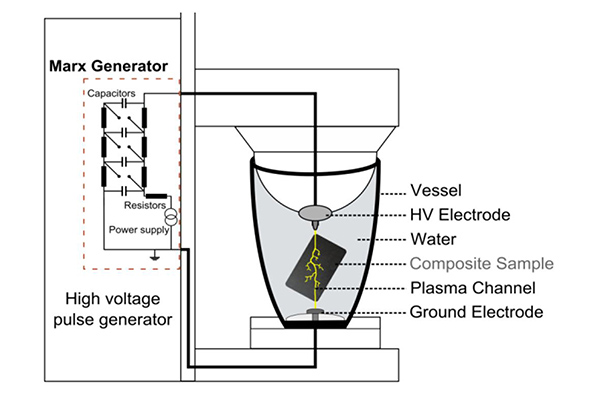 1、電碎裂處理:該方式是通過脈沖放電粉碎碳纖維復(fù)合材料,最初該方式開發(fā)應(yīng)用于從采礦巖石中提取晶體和寶石。電碎裂處理過程中,將碳纖維復(fù)合材料先放置在裝有水和兩個電極的容器中,在電極之間產(chǎn)生的高壓電脈沖 (50~200 kV) ,脈沖電壓將材料破碎成更小的碎片。電碎裂處理可以與傳統(tǒng)的機(jī)械處理方式對比,脈沖電壓引發(fā)的破碎效果更好,可以產(chǎn)生更長、更清潔的纖維部分,但也存在一些劣勢,如電碎裂的時間較長,能源消耗更大,而且可能對碳纖維造成一定的損傷,因此大規(guī)模應(yīng)用的價值偏低。