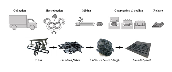 使用反向熱成型來回收廢物生產(chǎn)中產(chǎn)生的纖維增強(qiáng)熱塑性復(fù)合材料層壓板,主要過程是通過施加熱量(紅外輻射)和壓力,將成型的熱塑性碳纖維部件壓平,獲得熱塑性碳纖維薄板,但該處理方式是有前提的,必須熱塑性碳纖維部件中的碳纖維結(jié)構(gòu)完好無損,否則壓平后的薄板表面會出現(xiàn)褶皺等問題,影響外觀和性能。