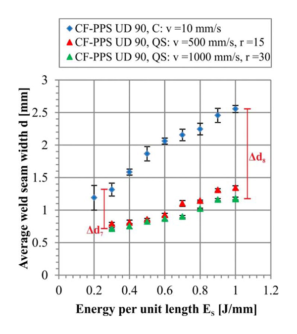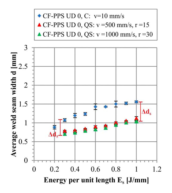 上圖為0°纖維方向上,CF/PPS復(fù)合材料輪廓焊接(C)的和準(zhǔn)同步焊接(QS),在每單位長(zhǎng)度上施加的能量與平均焊縫寬度的圖形數(shù)據(jù)對(duì)比??梢钥闯?°纖維方向上準(zhǔn)同步焊接(QS)的焊縫寬度整體都小于輪廓焊接(C)。這是因?yàn)榧す廨椛渫高^(guò)CF/PPS復(fù)合材料后會(huì)出現(xiàn)冷卻,多余的熱量不足以熔化更多的基體材料,而是向輻射位置前后傳導(dǎo)開(kāi)來(lái),因此焊縫寬度增加量很小,焊縫寬度級(jí)數(shù)之間的偏移幾乎是恒定的(圖中Δd5 ≈ Δd6 )。