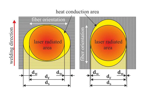 3、規(guī)律C:激光焊接過(guò)程中,產(chǎn)生的熱量高于基體熔化需求的熱量,在0°和90°方向上,多余熱量傳導(dǎo)方向并不相同,造成的焊縫范圍是有所區(qū)別的。0°纖維方向,熱量往激光輻射位置前后傳導(dǎo),90°垂直纖維方向,熱量往焊縫處傳導(dǎo),后者焊縫寬度更大。