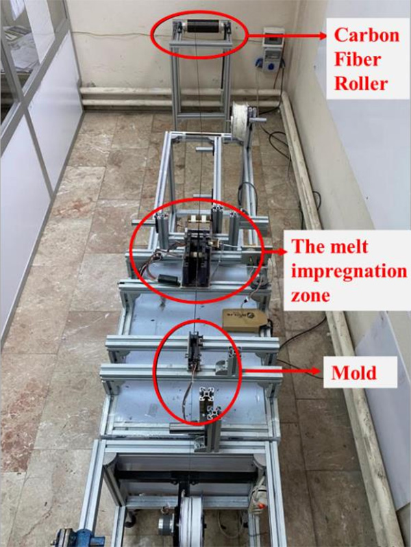 2、CF/PA長絲制備:使用熔融浸漬生產(chǎn)線將聚酰胺(PA)和碳纖維制成CF/PA長絲,生產(chǎn)線包括三個(gè)主要部分:纖維展開區(qū)、聚合物混合區(qū)和成型區(qū),CF/PA長絲制備完成后,待后續(xù)打印使用。