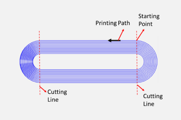 3、3D打印CF/PA樣品:打印CF/PA樣品時(shí)采用橢圓形的連續(xù)路徑(如上圖),參數(shù)預(yù)設(shè)為打印噴嘴溫度240°C,加熱床溫度80°C,3種打印速度(5mm/s、2.5mm/s和1.5mm/s),打印結(jié)束后,從剪切線上剪下圓角,獲得了兩個(gè)矩形三點(diǎn)彎曲測(cè)試樣品。