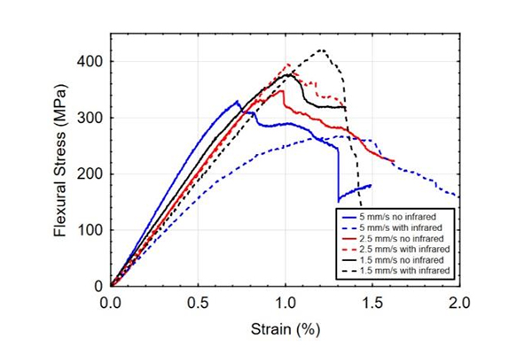 上表為三點(diǎn)彎曲測(cè)試中記錄的數(shù)據(jù)統(tǒng)計(jì)表,表中顯示1.5mm/s打印速度下,紅外加熱的CF/PA樣品具有最高的平均彎曲強(qiáng)度,約為418.99MPa。與1.5mm/s未使用紅外的樣品相比,1.5mm/s使用紅外的樣品彎曲強(qiáng)度增加了15.93%,彈性模量增加了21.93%。數(shù)據(jù)總體顯示,在低打印速度下,彎曲強(qiáng)度和模量的提升較為明顯,而在5mm/s這樣的高打印速度下,彎曲強(qiáng)度和模量反而呈現(xiàn)出較大的下降。