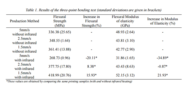 有國外專業(yè)團(tuán)隊(duì)進(jìn)行了3D打印熱塑性碳纖維復(fù)合材料的相關(guān)實(shí)驗(yàn),實(shí)驗(yàn)中以連續(xù)碳纖維和熱塑性樹脂聚酰胺(PA)作為基礎(chǔ)材料,并在打印過程中,使用紅外加熱器在打印噴嘴前加熱前一層復(fù)合材料以提高層間粘合性能,再通過三點(diǎn)彎曲測(cè)試研究了紅外加熱對(duì)CF/PA樣品機(jī)械性能的影響。