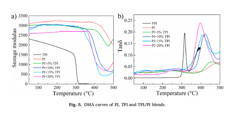 上圖(右)顯示,在固化的PI和TPI/PI樹(shù)脂的tanδ曲線中觀察到單一峰,沒(méi)有明顯的肩峰或顯著的展寬,表明TPI/PI混合物在固化后完全相容。由于TPI的Tg值相對(duì)較低,隨著TPI含量的增加,TPI/PI混合物的Tg值逐漸向低溫(左側(cè))方向移動(dòng),0%、5%、10%、15%和20%的TPI/PI混合物的Tg值分別為482°C、458°C、418°C、410°C和395°C。所有TPI/PI混合物的Tg值均高于395°C,表明具有優(yōu)異的耐熱性,TPI的加入并沒(méi)有大幅降低耐熱性能。
