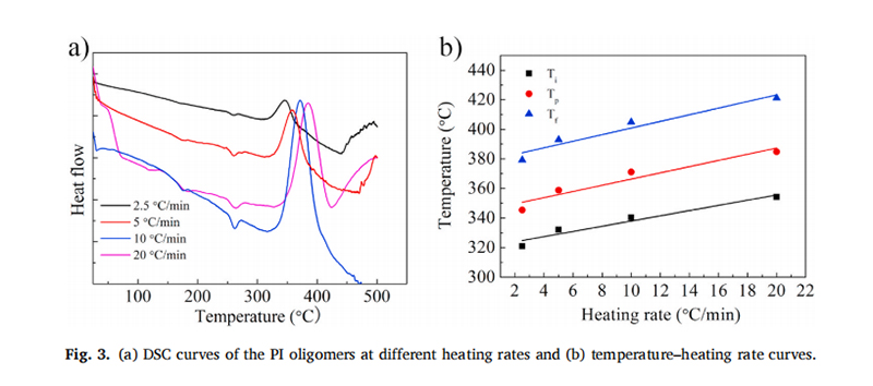 上圖(右)顯示了溫度-升溫速率的擬合線,其中Ti代表初始反應(yīng)溫度,Tp代表反應(yīng)峰溫度,Tf代表反應(yīng)終止溫度。根據(jù)溫度-升溫速率外推結(jié)果,通過(guò)外推到β=0的升溫速率,確定了PI寡聚物的固化過(guò)程參數(shù)。備注:Tgel(凝膠溫度)=320°C、Tcure(固化溫度)=345°C、Ttreat(后處理溫度)=378°C。