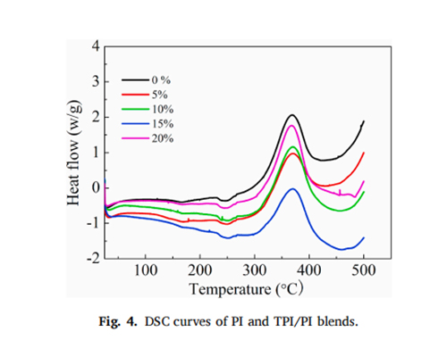 上圖顯示了不同TPI含量的TPI/PI混合物的DSC曲線,不同比例的TPI/PI混合物的固化反應(yīng)峰溫度都接近369°C,說(shuō)明TPI的加入,對(duì)PI樹(shù)脂系統(tǒng)的固化溫度幾乎沒(méi)有影響,TPI/PI混合物保持了PI固化行為和特性。