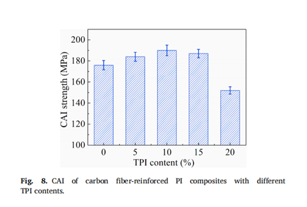 2、沖擊后壓縮強(qiáng)度(CAI):沖擊后壓縮強(qiáng)度(CAI)是表征復(fù)合材料韌性的重要指標(biāo),上圖顯示了不同TPI含量的TPI/PI混合物制備的CF/PI復(fù)合材料的沖擊后壓縮強(qiáng)度(CAI)強(qiáng)度。其中純高溫PI復(fù)合材料的CAI強(qiáng)度為176 MPa,而隨著TPI含量的增加,復(fù)合材料的CAI強(qiáng)度先增加后減少。當(dāng)TPI含量為10%時(shí),CAI最大值達(dá)到190 MPa,比PI系統(tǒng)高7.95%,15%TPI含量的CAI同樣高于純PI復(fù)合材料的CAI,當(dāng)TPI含量達(dá)到20%時(shí),由于熔體粘度增加,CAI為152MPa,下降了13.6%。
