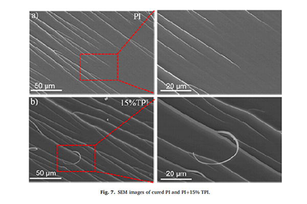 上圖顯示,固化PI樹(shù)脂的斷裂表面光滑,表現(xiàn)出典型的脆性特征。相比之下,15%含量的TPI/PI混合物的斷裂表面表現(xiàn)出韌性斷裂特征,表明TPI和PI之間具有良好的相容性,TPI的引入顯著提高了PI的韌性。