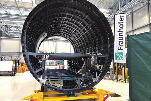 熱塑性復合材料上機身殼體采用纖維帶鋪放和原位固結工藝制造,由Premium Aerotec、空客、Aernnova和德國航空航天中心組成的聯合團隊共同完成。上、下機身殼體均具有高度預集成度,采用幾乎無鉚釘的架構設計,與現有傳統(tǒng)機身相比重量減輕10%。